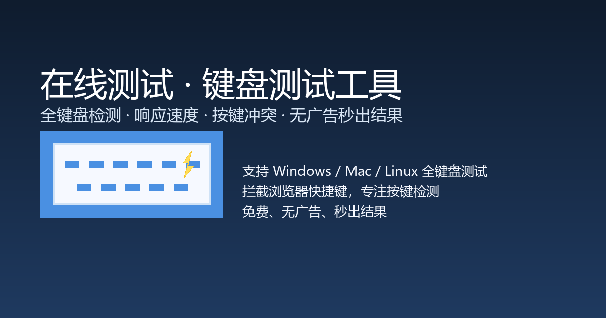 在线测试是一款专为键盘爱好者、办公用户与游戏玩家打造的免费键盘检测工具。页面会自动拦截浏览器与系统快捷键,避免 F1/F5、Win、Menu、方向键、分页键等触发默认行为,让你专注测试。支持 Windows、Mac、Linux 三大平台,全键盘可视化点亮,每次按键都会被统计,包含响应时间、已测试总数等指标。数字小键盘、功能键(F1-F12)、导航区、方向区均可独立高亮,便于快速定位坏键、粘键或冲突问题。